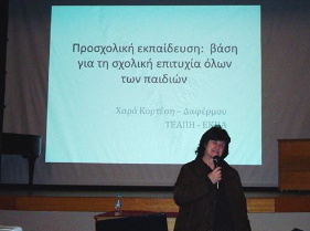 Η κ. Δαφέρμου, καθηγήτρια στο Πανεπιστήμιο Αθηνών στο τμήμα της Προσχολικής εκπαίδευσης, ήταν η κεντρική εισηγήτρια της εκδήλωσης και αναφέρθηκε στη φιλοσοφία του προγράμματος του νηπιαγωγείου και στη σημασία του για την μαθησιακή πορεία των παιδιών.