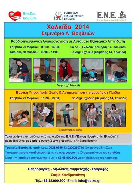 Τρία σεμινάρια πρώτων βοηθειών θα πραγματοποιηθούν το Σαββατοκύριακο 29 και 30 Μαρτίου στο 9ο Δημοτικό Σχολείο Χαλκίδας ( οδός Χειμάρας 14), με πρωτοβουλία της πιστοποιημένης διασώστριας Σοφίας Χονδρογιάννη.