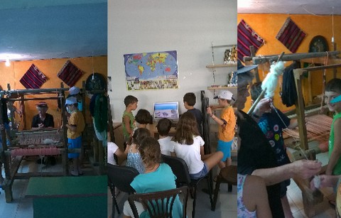 Έπειτα τα παιδιά είδαν από κοντά τον αργαλειό του Εκπολιτιστικού Συλλόγου Καθενών και με την βοήθεια της Βασιλικής Λιάρου διασκέδασαν και έμαθαν να υφαίνουν.