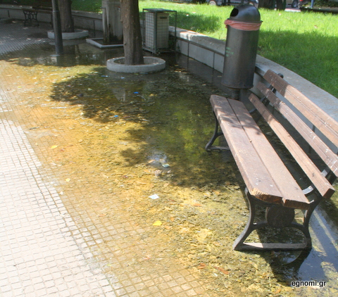 Έτσι το νερό μόνο χύνεται άσκοπα, αλλά λιμνάζει στο σημείο που βλέπετε στη φωτογραφία και καθιστά άχρηστα και τα παγκάκια, αφού όποιος επιθυμεί να καθίσει θα πρέπει να φοράει ...βατραχοπέδιλα, για να μην βραχεί.