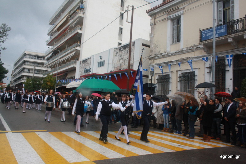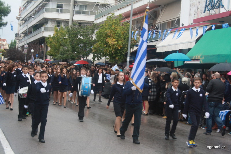 Μπόμπιρες και κουκλίτσες δεν πτοήθηκαν από το βροχερό καιρό και παρέλασαν με καμάρι. Τους χειροκρότησαν οι γονείς τους, αλλά μόλις τελείωναν τους βούταγαν και τους φόραγαν μπουφανάκι για να μην κρυώσουν.