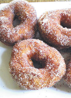 Ανακατεύω το γάλα με το μέλι, τη ζάχαρη και τη μαγιά. Στο μπολ του μίξερ ανακατεύω το αλεύρι με όλα τα υπόλοιπα υλικά και χτυπώ στη μέτρια ταχύτητα για 6 περίπου λεπτά. Αφήνω τη ζύμη σκεπασμένη να φουσκώσει για 1 περίπου ώρα. Πλάθω ίσες μπαλίτσες με τη ζύμη που τις πατώ και με μια μικρή κουπ αφαιρώ το κέντρο δημιουργώντας έτσι μικρά δαχτυλίδια. Τηγανίζω σε μπόλικο λάδι μέχρι να πάρουν όμορφο χρυσαφί χρώμα. Στεγνώνω σε χαρτί κουζίνας και περνώ από το μείγμα ζάχαρης κανέλας.
