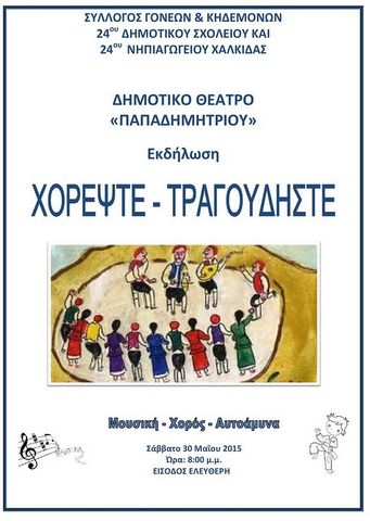 Η εκδήλωση του Συλλόγου Γονέων και Κηδεμόνων του 24ου Δημοτικού Σχολείου Χαλκίδας και του 24ου Νηπιαγωγείου Χαλκίδας για την λήξη της σχολικής χρονιάς περιλαμβάνει μουσική, τραγούδι και ασκήσεις αυτοάμυνας, από τα παιδιά των δύο σχολείων.