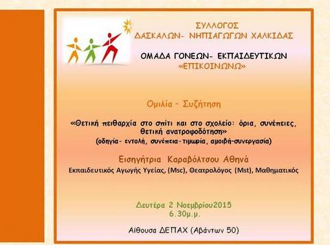 Ο Σύλλογος Δασκάλων και νηπιαγωγών Χαλκίδας και η Ομάδα Γονέων-Εκπαιδευτικών "Επικοινωνώ" διοργανώνει ομιλία-συζήτηση, με θέμα: "Θετική πειθαρχία στο σπίτι και στο σχολείο: όρια, συνέπειες, θετική ανατροφοδότηση".