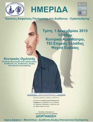 Η εκδήλωση θα πραγματοποιηθεί την Τρίτη 1 Δεκεμβρίου, στις 12 το μεσημέρι, στο κεντρικό αμφιθέατρο του ΤΕΙ Στερεάς Ελλάδας, στα Ψαχνά Ευβοίας (περιοχή Σκληρό).Βασικοί ομιλητές της εκδήλωσης θα είναι ο Διευθυντής της Διεύθυνσης Δίωξης Ηλεκτρονικού Εγκλήματος, Υποστράτηγος Εμμανουήλ Σφακιανάκης, καθώς και εξειδικευμένοι αξιωματικοί της ανωτέρω Διεύθυνσης