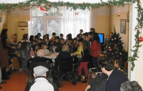 Τα παιδιά βρέθηκαν στον μεγάλο χώρο του σαλονιού και, παρουσία των γερόντων, έψαλλαν το Απολυτίκιο της Γεννήσεως του Χριστού και στην συνέχεια παρουσίασαν όμορφα Χριστουγεννιάτικα Τραγούδια.