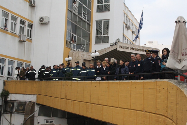Υπάλληλοι της Πυροσβεστικής μαζί με το διοικητή τους παρακολουθούν τον απεγκλωβισμό του τραυματία.