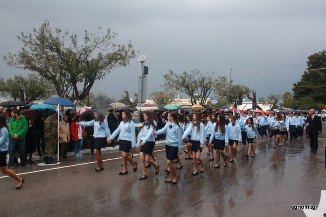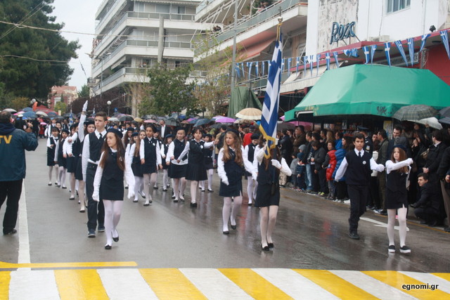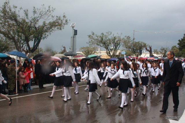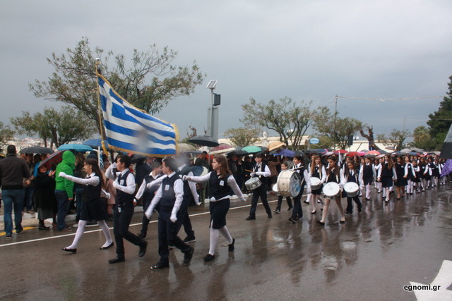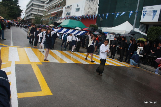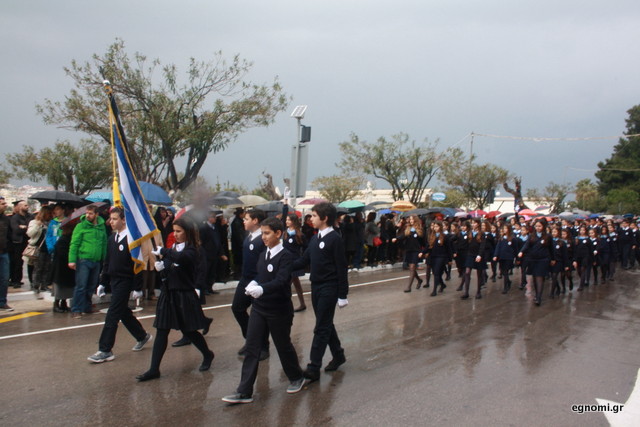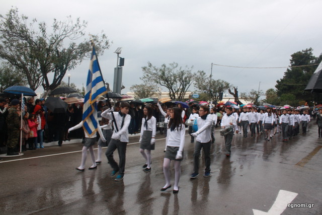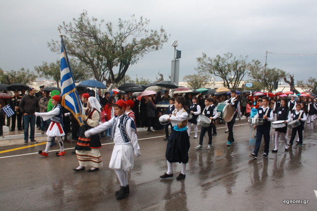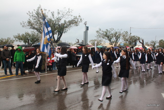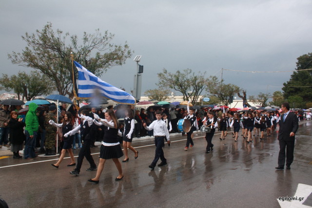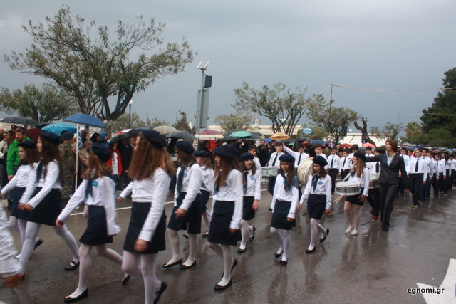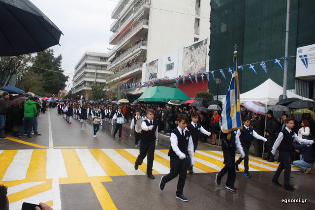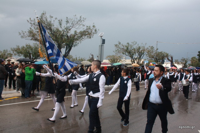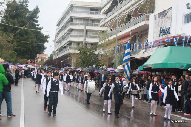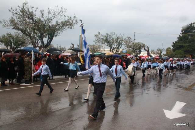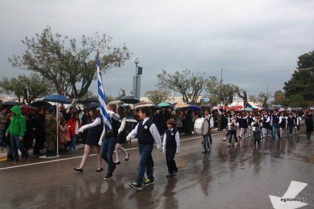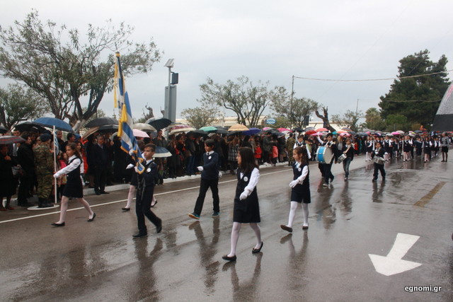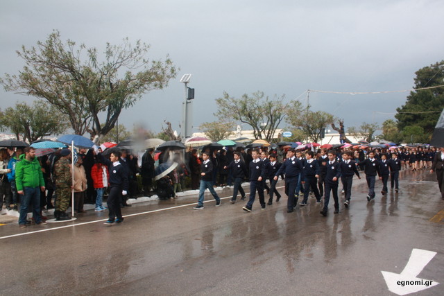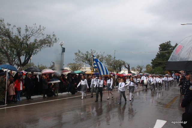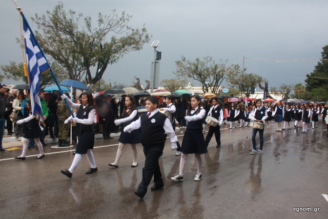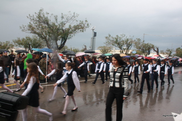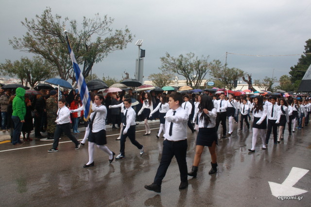 Άτυχοι αποδείχτηκαν οι μαθητές των δημοτικών σχολείων της Χαλκίδας, αφού την ώρα που ήρθε η σειρά τους να παρελάσουν δυνάμωσε η βροχή. Συνέχισαν, όμως, απτόητοι με πολλούς μπόμπιρες να γελούν επειδή παρέλαζαν μέσα στη βροχή.