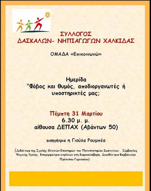 Ο Σύλλογος Δασκάλων- Νηπιαγωγών Χαλκίδας και η ομάδα «Επικοινωνώ» διοργανώνει ημερίδα με θέμα «Φόβος και θυμός, αποδιοργανωτές ή υποστηρικτές μας» με εισηγήτρια την Γιούλα Ρουμπέα την Πέμπτη 31 Μαρτίου, στις 6:30 το απόγευμα, στην αίθουσα της ΔΕΠΑΧ (Αβάντων 50)