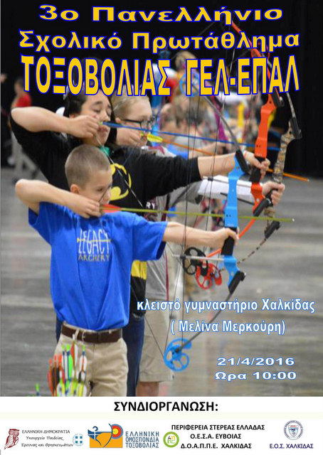 Το 3ο Πανελλήνιο Πρωτάθλημα Τοξοβολίας ΓΕΛ – ΕΠΑΛ θα πραγματοποιηθεί στο Κλειστό Γυμναστήριο Χαλκίδας «Μελίνα Μερκούρη», την Πέμπτη 21 Απριλίου. Η ώρα έναρξης των αγώνων είναι στις 10:30 το πρωί.