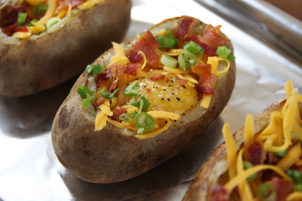 Βράζουμε τις πατάτες με τη φλούδα σε αλατισμένο νερό για 15΄. Τις αδειάζουμε από το εσωτερικό και τις αφήνουμε σε σχήμα σαν βαρκούλα. Τις τοποθετούμε σε φωλιές από αλουμινόχαρτο. Βάζουμε μέσα στην πατάτα το μπέικον, προσθέτουμε το λάδι και τα μπαχάρια.