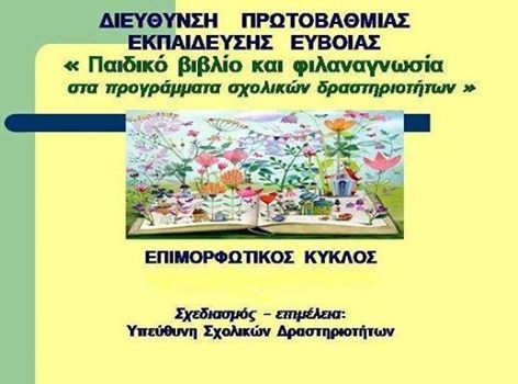 Η Διεύθυνση Πρωτοβάθμιας Εκπαίδευσης Εύβοιας με την ολοκλήρωση του επιμορφωτικού κύκλου «Παιδικό βιβλίο και φιλαναγνωσία στα προγράμματα σχολικών δραστηριοτήτων» διοργανώνει σεμινάριο στο Κόκκινο Σπίτι, στη Χαλκίδα, την Δευτέρα 30 Μαΐου, από τις 5:45 το απόγευμα μέχρι τις 9 το βράδυ.