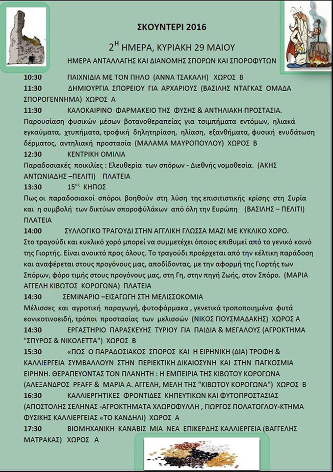 Ανοικτή για όλους είναι η γιορτή ανταλλαγής σπόρων από γνήσιες ντόπιες ποικιλίες, που αναβλήθηκε λόγω κακοκαιρίας και θα πραγματοποιηθεί τελικά το Σάββατο 28 και την Κυριακή 29 Μαΐου στο Σκουντέρι του Δήμου Διρφύων Μεσσαπίων.