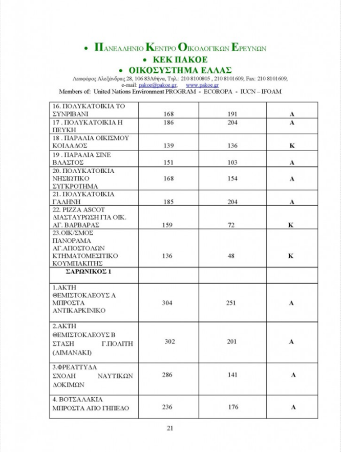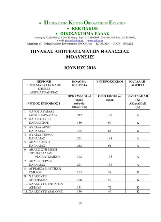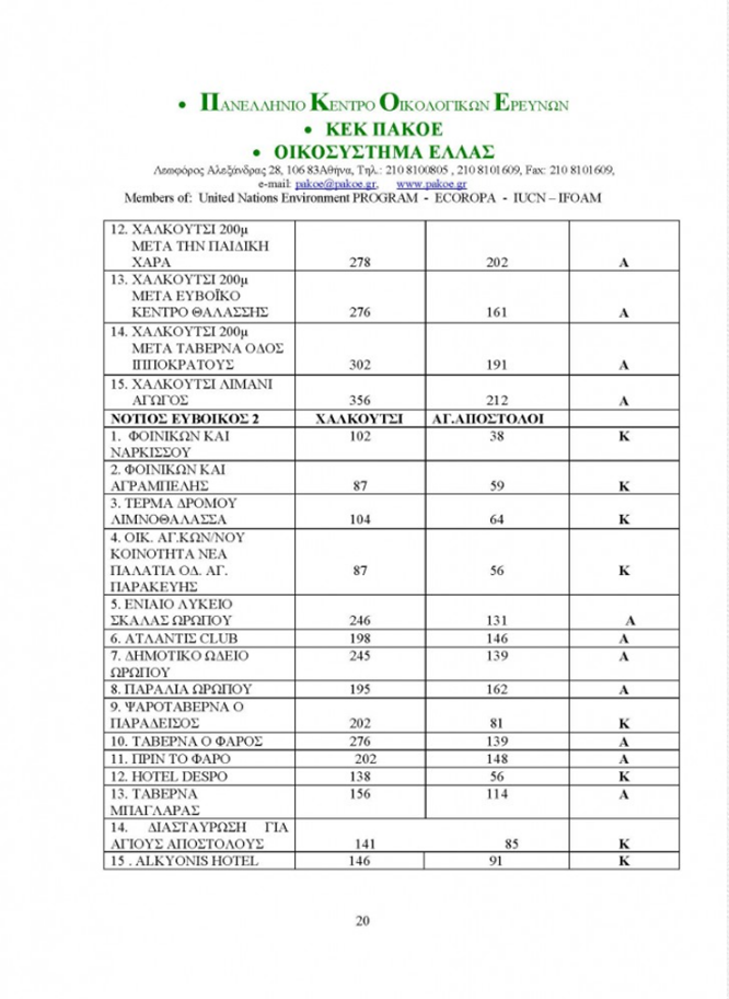 Ανησυχία προκαλεί και φέτος η δημοσιοποίηση έρευνας του ΠΑΚΟΕ για την καταλληλότητα των νερών κολύμβησης. Σύμφωνα με την έρευνα και τις αναλύσεις νερού της οικολογικής οργάνωσης οι ακόλουθες παραλίες του Ευβοϊκού που έχουν την ένδειξη "Α" είναι ακατάλληλες για κολύμβηση.