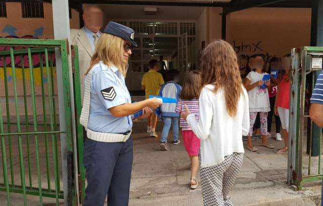 Οι τροχονόμοι μοίρασαν ενημερωτικά φυλλάδια κυκλοφοριακής αγωγής και ευχές για μια καλή σχολική χρονιά σε γονείς και μικρούς μαθητές, κατά την προσέλευσή τους στα σχολεία.