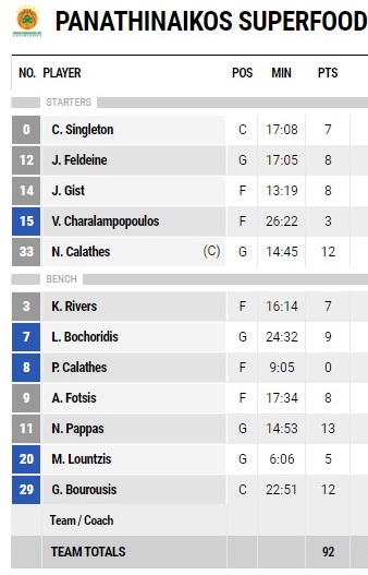 Για τον Παναθηναϊκό η αποκάλυψη ήταν ο Λευτέρης Μποχωρίδης που πήρε πολύ χρόνο από τον Πασκουάλ στο β' ημίχρονο κι έβγαλε τον προπονητή του ...ασπροπρόσωπο, καθώς είχε 9 πόντους, 9 ριμπάουντ, 6 ασίστ, 1 κλέψιμο, 1 κόψιμο και 1 λάθος σε 25 λεπτά.