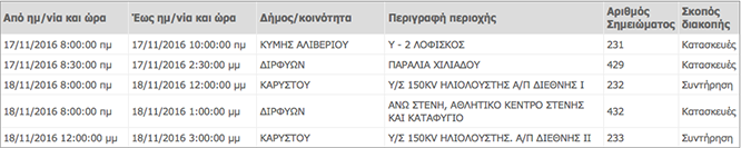 Δείτε στον ακόλουθο πίνακα ποιες περιοχές θα μείνουν χωρίς ρεύμα...