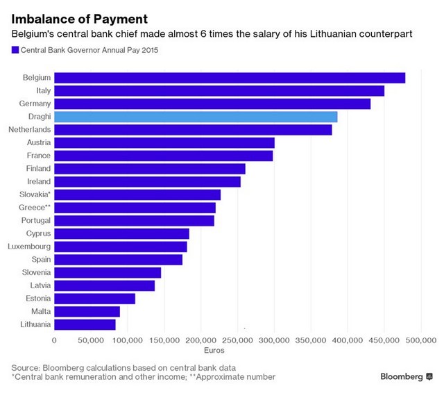 Πάντως, το Bloomberg διαπιστώνει μια αναντιστοιχία στις απολαβές των ισχυρών ανδρών των οικονομιών ανά χώρα. Για παράδειγμα, αν και η οικονομία του Βελγίου αντιστοιχεί μετά βίας στο 1/8 της γερμανικής, ο Βέλγος κεντρικός τραπεζίτης έχει μισθό 10% υψηλότερο από τον πρόεδρο της Bundesbank, Jens Weidmann!
