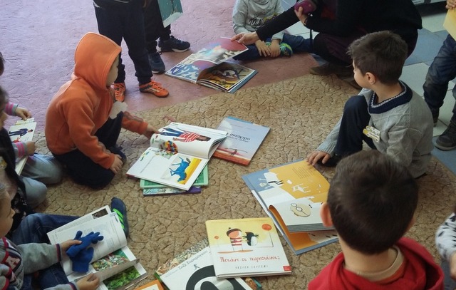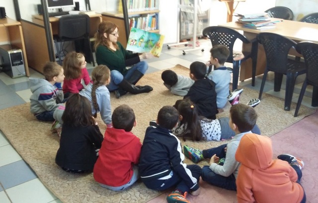Αφού πραγματοποιήθηκε γνωριμία με τις υπηρεσίες και τους κανόνες λειτουργίας της βιβλιοθήκης, τα παιδιά άκουσαν το παραμύθι του David Mc Kee «Έλμερ, ο παρδαλός ελέφαντας».