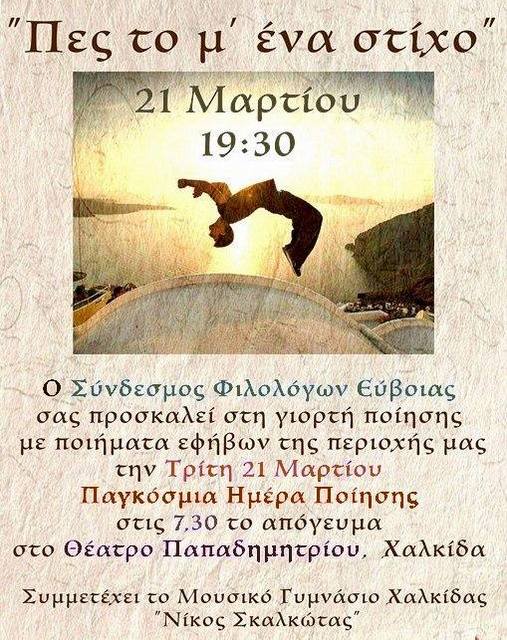 Ο Σύνδεσμος Φιλολόγων Εύβοιας διοργανώνει γιορτή ποίησης, την Τρίτη 21 Μαρτίου (παγκόσμια ημέρα της ποίησης), στις 7:30 το απόγευμα, στο Θέατρο Παπαδημητρίου, στη Χαλκίδα.