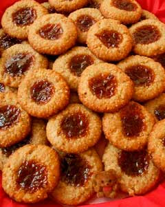 Βάζουμε στη λακκούβα λίγη από τη μαρμελάδα, χωρίς να την υπερχειλίσουμε και ψήνουμε σε προθερμασμένο φούρνο στους 180C για 13-16 λεπτά. Αφήνουμε να κρυώσουν 5-10 λεπτά.