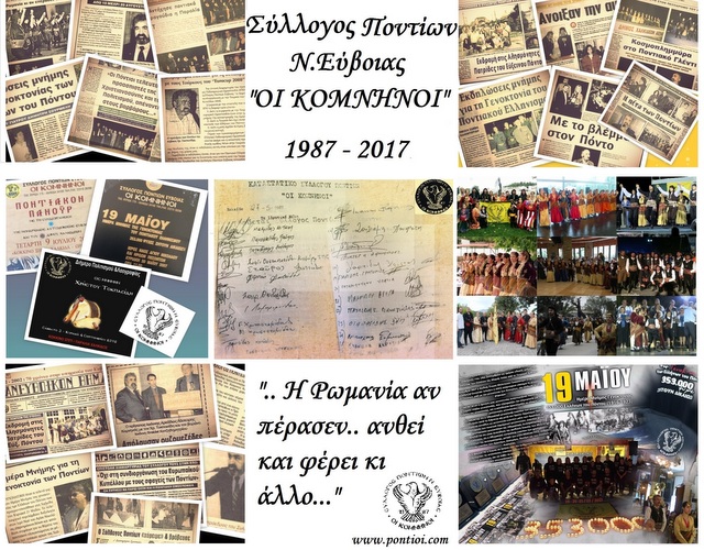 Η 27η Μαΐου 2017 αποτελεί μια ιστορική ημέρα για το Σύλλογο Ποντίων Ν. Εύβοιας « Οι Κομνηνοί ». Μια μέρα ιδιαίτερης τιμής για το Διοικητικό Συμβούλιο και τα μέλη μας μιας και σήμερα συμπληρώνονται 30 χρόνια από την ιδρυτική διακήρυξη του συλλόγου και αποτελεί την κορυφαία στιγμή στην οποία η καθεμία και ο καθένας από εμάς συνειδητοποιεί το βαρύ φορτίο και συνάμα την αέναη χαρά να είναι εδώ και να συνεχίζει να υπηρετεί τους ιερούς σκοπούς που διέπουν κάθε ποντιακό σωματείο.