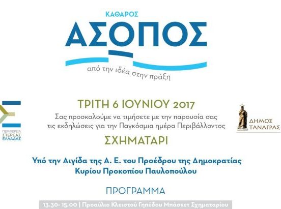 Με σύνθημα «Καθαρός Ασωπός- Από την ιδέα στην πράξη» πραγματοποιούνται φέτος οι εκδηλώσεις που διοργανώνει η Περιφέρεια Στερεάς Ελλάδας και ο Δήμος Τανάγρας για την Παγκόσμια ημέρα Περιβάλλοντος, την Τρίτη 6 Ιουνίου, στο Σχηματάρι.