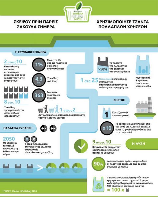 Ο Έλληνας παίρνει κατά Μ.Ο. 3,9 σακούλες ανά επίσκεψη στο σουπερμάρκετ. Αυτός αντιστοιχεί σε περίπου 270 πλαστικές σακούλες κατά κεφαλήν μόνο από τα σούπερ μάρκετ.