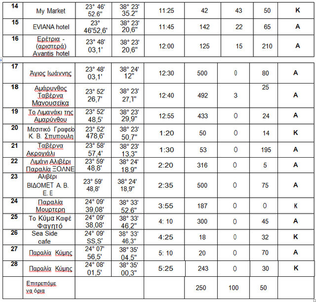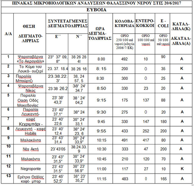 Συγκεκριμένα, στην ευρύτερη περιοχή της Εύβοιας ελέγχθηκαν συνολικά 28 σημεία. Από αυτές τις παραλίες οι 21 κρίθηκαν ακατάλληλες για κολύμβηση και οι 7 κατάλληλες.