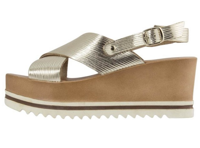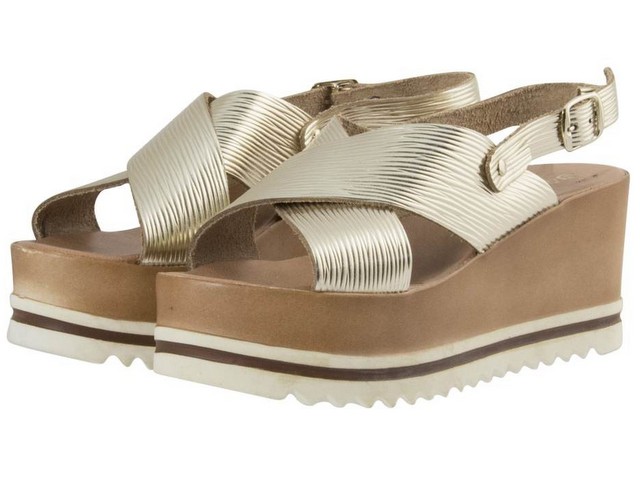 Γυναικείο πέδιλο της εταιρίας Jasmin με φαρδιά χιαστί λουράκια σε χρυσό μεταλλιζέ δέρμα σαγρέ και αντιολισθητική tracksole. Θα τα βρείτε στο κατάστημα υποδημάτων TOP SHOES (δείτε τη διεύθυνση εδώ).