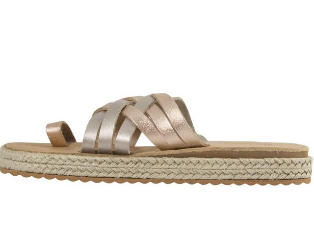 Χειροποίητα σανδάλια ελληνικής κατασκευής με δαχτυλίδι σε χάλκινη απόχρωση και λεπτά λουράκια πλεγμένα περίτεχνα στο κουντεπιέ από γνήσιο δέρμα σε μεταλλιζέ χρώμα. Δερμάτινος πάτος και σόλα flatform με τρέσσα σχοινιού. Ενα κομμάτι must have μόνο από το κατάστημα TOP SHOES (δείτε διεύθυνση εδώ).