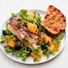 Προθέρμανε το φούρνο στο γκριλ, άλειψε μια σχάρα με λάδι και τοποθέτησέ τη στο φούρνο με ένα ταψί από κάτω για να μην στάξουν οι ζωμοί. Καθάρισε καλά και κόψε σε μπουκιές τα δύο πορτοκάλια, τοποθέτησέ τα σε ένα μπολ μαζί με το χυμό από το τρίτο πορτοκάλι, το λάδι, την πιπεριά ψιλοκομμένη, τις ελιές, αλάτι και πιπέρι.