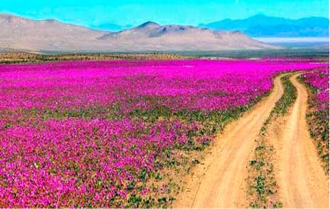 Η πιο ξερή έρημος του κόσμου, η Atacama στην Χιλή, όπου μάλιστα οι επιστήμονες τη χρησιμοποιούν για να αναλύσουν πώς θα είναι οι συνθήκες διαβώσης στον πλανήτη Αρη, γέμισε λουλούδια λόγω των έντονων βροχοπτώσεων το τελευταίο διάστημα, με αποτέλεσμα η έρημος να γίνει ...πίνακας της φύσης με αμέτρητα λουλούδια σε χρώματα του ροζ, του μωβ και του πράσινου.