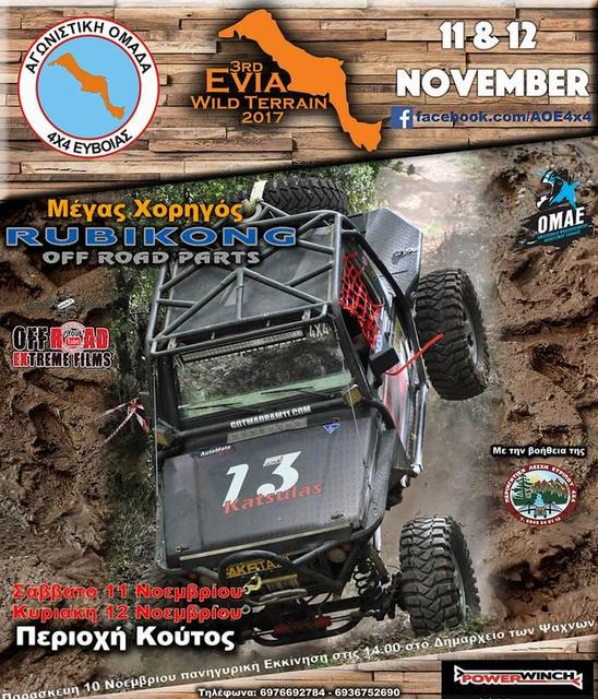 Η Αγωνιστική Ομάδα 4Χ4 Εύβοιας ανακοινώνει την διοργάνωση του "3rd Evia Wild Terrain" το Σαββατοκύριακο 11 και 12 Νοεμβρίου 2017. Ο τεχνικός έλεγχος και η πανηγυρική εκκίνηση θα γίνει την Παρασκευή 10 Νοεμβρίου, μπροστά από το Δημαρχείο Ψαχνών, σε μια γιορτή του 4Χ4.