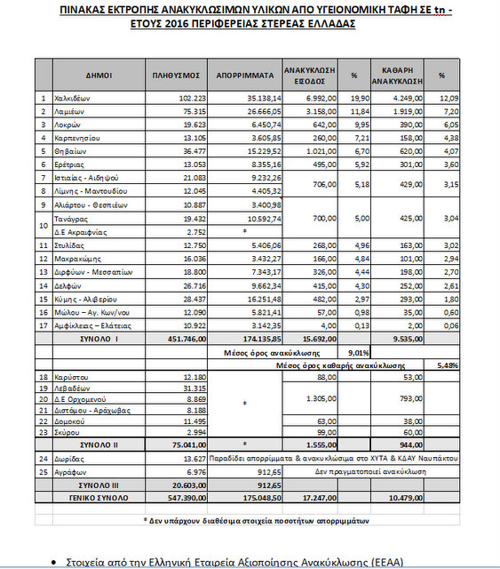 Ο Φορέας Διαχείρισης Αποβλήτων (ΦΟΔΣΑ) Στερεάς Ελλάδας έδωσε στη δημοσιότητα τα στοιχεία της ανακύκλωσης των υλικών συσκευασίας των Δήμων της Περιφέρειας Στερεάς Ελλάδας για το έτος 2016.