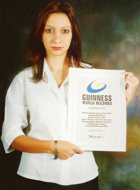 Συγκεκριμένα, το 2001 έκανε παγκόσμιο ρεκόρ σε αγώνα Σιμουλτανέ (ταυτόχρονο παίξιμο), ενάντια σε 1102 αντιπάλους σε συνολικά 33 ώρες ασταμάτητου παιξίματος (7 ισοπαλίες, 1095 νίκες), στα Καλάβρυτα. Το ρεκόρ κατέγραψε το βιβλίο Γκίνες το 2002!