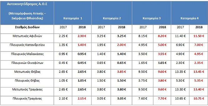 Στον ακόλουθο πίνακα παρουσιάζονται με κόκκινο χρώμα οι τιμές που έχουν αυξήσεις από 0.05€ έως 0.10€ και με μαύρο χρώμα όσες παραμένουν αμετάβλητες σε σύγκριση με το 2017.