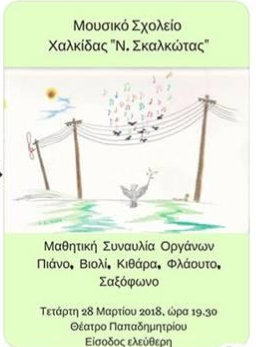 Το Μουσικό Σχολείο Χαλκίδας "Νίκος Σκαλκώτας" διοργανώνει μαθητική συναυλία, κατά την οποία μαθητές του σχολείου θα παίξουν πιάνο, βιολί, κιθάρα, φλάουτο και σαξόφωνο.