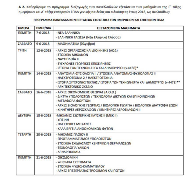 Αντίστοιχα, το πρόγραμμα των πανελλαδικών εξετάσεων για τα ΕΠΑΛ είναι το εξής: