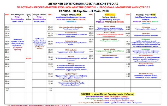 Η Διεύθυνση Δευτεροβάθμιας Εκπαίδευσης Εύβοιας διοργανώνει την Παρουσίαση των Προγραμμάτων Σχολικών Δραστηριοτήτων - Εβδομάδα Μαθητικής Δημιουργίας.