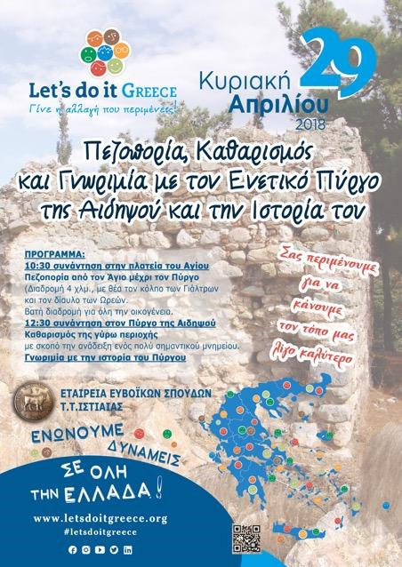 Στο πλαίσιο της εκστρατείας "Let's do it Greece", το τοπικό τμήμα Ιστιαίας της Εταιρείας Ευβοϊκών Σπουδών διοργανώνει εκδήλωση την Κυριακή 29 Απριλίου, στον Πύργο της Αιδηψού.