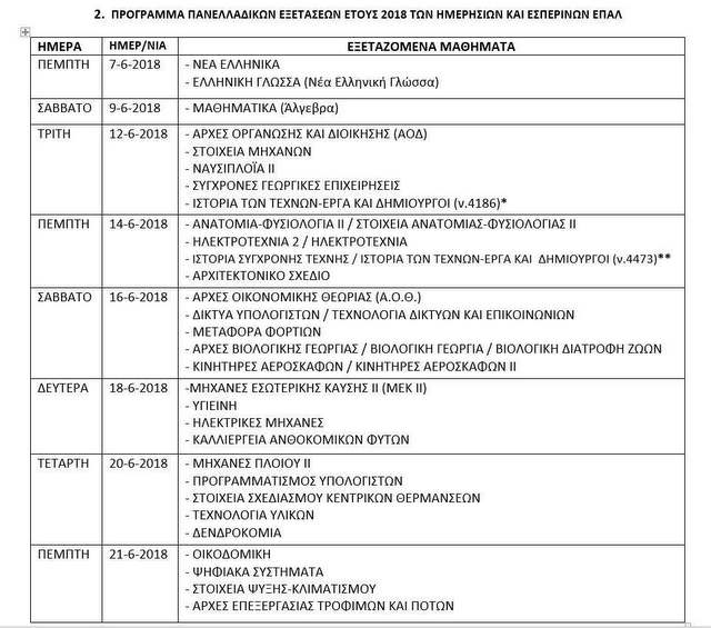 Το πρόγραμμα των εξετάσεων για τα Ημερήσια και Εσπερινά ΕΠΑΛ είναι το εξής: