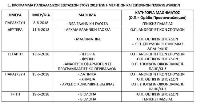 Από το Υπουργείο Παιδείας ανακοινώνεται ότι με Υπουργική Απόφαση καθορίστηκε το πρόγραμμα των πανελλαδικών εξετάσεων 2018.