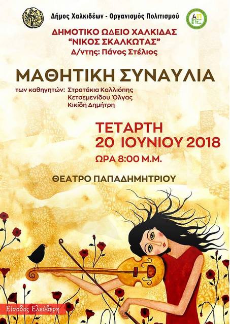 Ο Δημοτικός Οργανισμός Άθλησης Πολιτισμού και Περιβάλλοντος Χαλκίδας (Δ.Ο.Α.Π.Π.Ε.Χ.) και το Δημοτικό Ωδείο «Ν. Σκαλκώτας», διοργανώνουν «Μαθητική Συναυλία», των τάξεων των καθηγητών του Ωδείου, Καλλιόπης Στρατάκια, Όλγας Κετσεμενίδου και Δημήτρη Κικίδη.