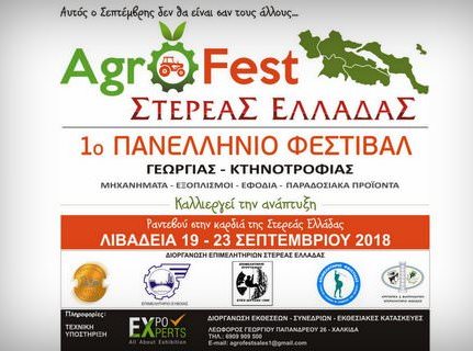 Όλα τα Επιμελητήρια της Στερεάς Ελλάδας, θα συνδιοργανώσουν το 1ο Πανελλήνιο Φεστιβάλ Γεωργίας και Κτηνοτροφίας, AGROfest ΣΤΕΡΕΑΣ ΕΛΛΑΔΑΣ, από 19 μέχρι 23 Σεπτεμβρίου 2018, στις εγκαταστάσεις του Επιχειρηματικού Πάρκου Λιβαδειάς (πρώην Unicot).