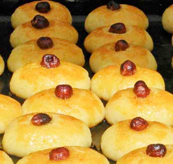 Σε μία κατσαρόλα ζεσταίνουμε ελαφρώς το γάλα, την άχνη, το μπέικιν και τα αυγά. Αφού κρυώσουν λίγο προσθέτουμε το βούτυρο, το αλεύρι και το σιμιγδάλι μέχρι να γίνει σφιχτή η ζύμη. Τοποθετούμε τη ζύμη στο πάγκο μας και την πλάθουμε σε μικρά μπαλάκια και μόλις τελειώσουμε βάζουμε και από ένα φουντούκι σε κάθε κομμάτι. Ψήνουμε σε προθερμασμένο φούρνο στους 180ο C για 40΄-45΄.