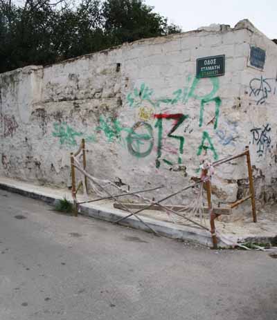 Πεζοδρόμιο αποκλεισμένο για πεζούς. Ενας τοίχος που καταρρέει και μια σκαλωσιά (;) που δεν ξέρουμε για ποιο λόγο βρίσκεται εκεί.