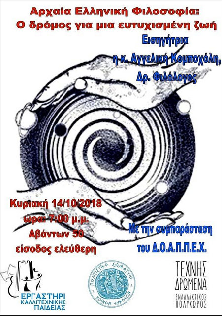 Διάλεξη με θέμα "Αρχαία ελληνική φιλοσοφία: Ο δρόμος για μία ευτυχισμένη ζωή" θα πραγματοποιηθεί την Κυριακή 14 Οκτωβρίου, στις 7 το απόγευμα, στη συνεδριακή αίθουσα του Δήμου Χαλκιδέων (οδός Αβάντων 50).