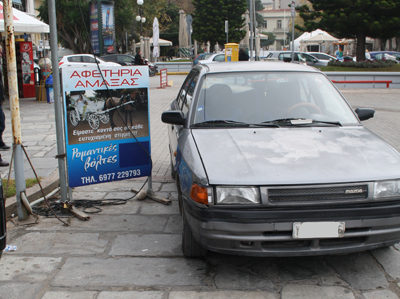 "Αφετηρία άμαξας" γράφει η πινακίδα, αλλά αυτό το όχημα που είναι παρκαρισμένο μοιάζει με άμαξα; Τώρα τι να πρωτοσχολιάσει κανείς, ότι το ΙΧ πήρε τη θέση της άμαξας ή ότι πάρκαρε στην παραλία, όπου απαγορεύεται να παρκάρει έτσι κι αλλιώς.