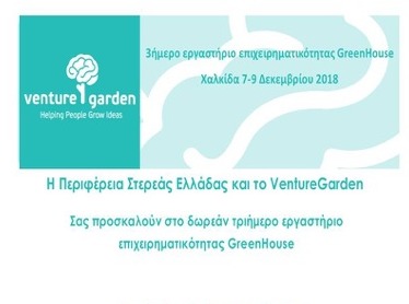 H Περιφέρεια Στερεάς Ελλάδας και το Venture Garden διοργανώνουν τριήμερο εργαστήριο επιχειρηματικότητας Greenhouse στη Χαλκίδα, από 7 μέχρι 9 Δεκεμβρίου, στο Διοικητήριο της Περιφερειακής Ενότητας Εύβοιας (αίθουσα Περιφερειακού Συμβουλίου).